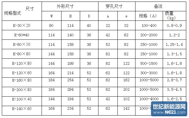 5.開口保護型電流互感器規格參數對照表