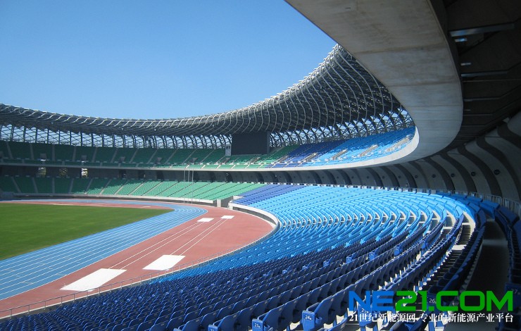 臺灣的太陽能體育場覆蓋著8844塊太陽能電池板,外形好似爬行動物身上的鱗片。這座體育場坐落于一個未開發的地帶,外形好似一條龍,太陽能電池板的發電量足以滿足體育場的用電需求。值得一提的是,公共綠色活動區和生態池塘和體育場位于同一區域。