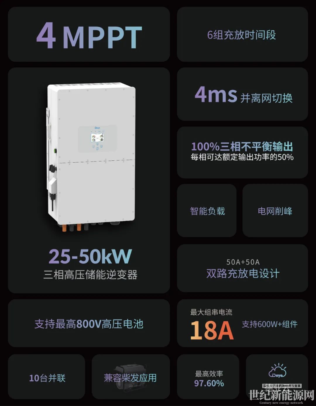 針對澳洲地區電價相對較高的客觀情況,德業還特別展示了面向未來的先進大功率三相高壓儲能逆變器——SUN-25K/30K/40K/50K-SG01HP3,其最高額定交流輸出功率達50kW,特別設計有兩個獨立的電池連接端口,支持160-800V的高壓儲能電池,能夠實現50A+50A的雙路最高100A充放電能力。該系列逆變器還支持最多4 路MPPT接入,每路MPPT支持接入2串組串,最大支持組串電流18A,輕松適配600W級的大功率組件。同時,它還可設定6個充放時間段,支持多達10臺并聯,具備智能負載、電網削峰等眾多智能功能。