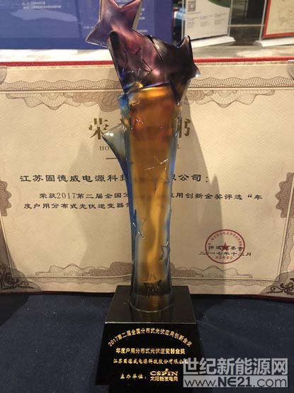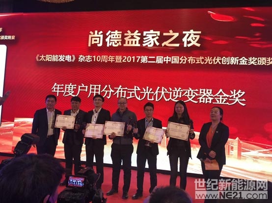 “金九銀十”無疑是一年中最美好的季節(jié),也是收獲的季節(jié)。在這收獲的時(shí)節(jié),固德威在戶用分布式光伏領(lǐng)域不斷積累寶貴經(jīng)驗(yàn)的同時(shí),潛心鉆研優(yōu)質(zhì)產(chǎn)品,密切跟隨客戶需求,因此也不斷獲得光伏行業(yè)和企業(yè)同行給予的肯定。此次評(píng)選,固德威以其不可小覷的實(shí)力和較高的推廣價(jià)值,贏得大獎(jiǎng)。大會(huì)將“2017年度中國最佳戶用分布式光伏逆變器金獎(jiǎng)”的稱號(hào)給予固德威,以激勵(lì)固德威在戶用分布式光伏逆變器中做出的杰出貢獻(xiàn)。