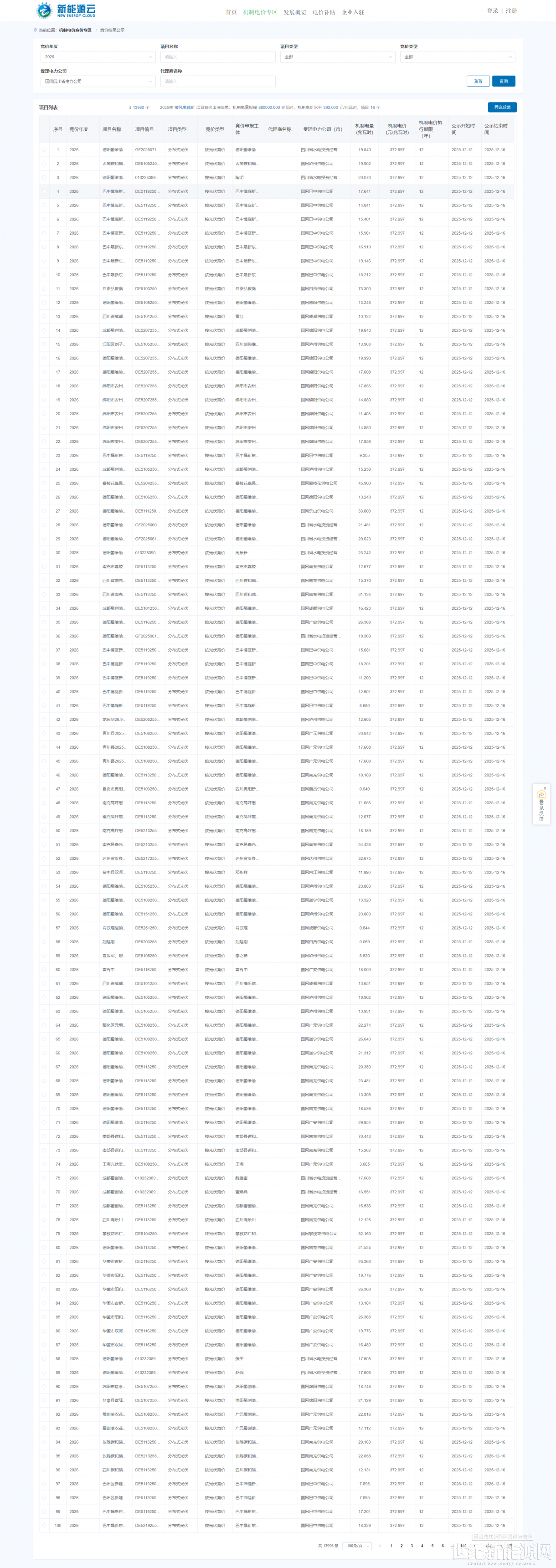 12月12日,國網新能源云公示四川省新能源機制電價競價結果,共13996個新能源項目入圍。