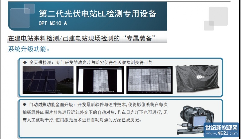 . 自動對焦功能全面升級--開發最新軟件與硬件技術,使得影像系統在每次拍攝組件EL圖片前先進行近紅外光下的自動對焦,且在日光燈下也可進行,無需人工被動干抒,使用激光技術進行自動對焦的方法己成歷史.