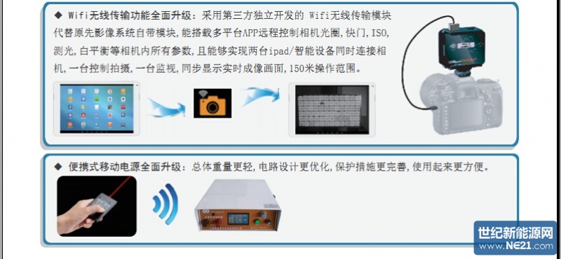 . Wifi無線傳輸功能全面升級--采用第三方獨立開發的 Wifi無線傳輸模塊代替原先影像系統自帶模塊,能搭載多平臺APP遠程控制相機光圈,快門,ISO,測光,白平衡等相機內所有參數,且能夠實現兩臺ipad/智能設備同時連接相機,一臺控制拍攝,一臺監視,同步顯示實時成像畫面,150米操作范圍.