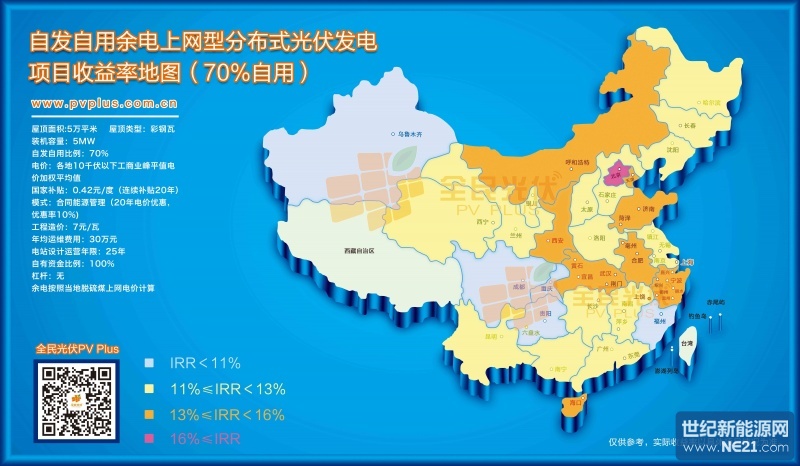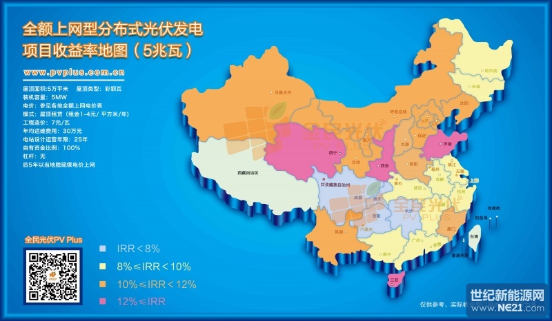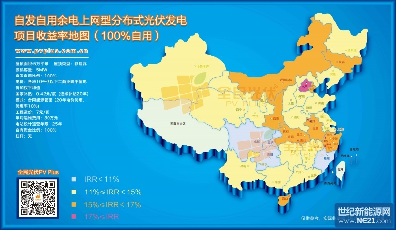 如圖可知,如果在橘紅和深粉色省份或地市投資建設一個5兆瓦的100%自發自用型分布式光伏發電項目,收益率會高達15%以上!而且是穩穩20年不變的穩定現金流收益!這種項目,此時不搶更待何時?