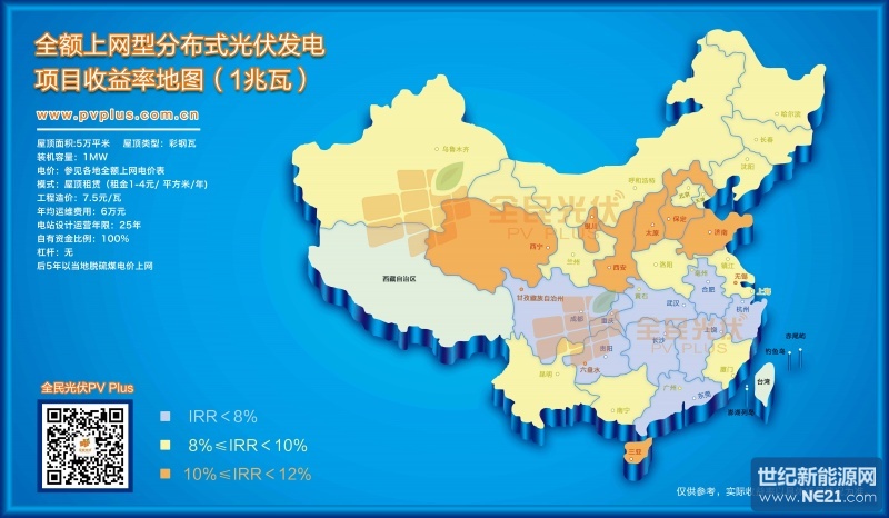 也就是說,在絕大部分地區,如果您投資建設了一個只有1MW的全額上網型分布式光伏發電項目,收益率都在8%~11%之間,比5MW項目收益率低1個百分點左右。但是它極其穩定的20年不變收益率,相比其他投資標的,還是非常值得考慮的!