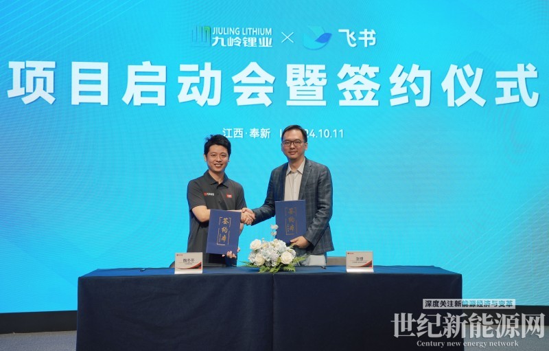 九嶺鋰業總裁魏冬冬和飛書通用行業商業化總經理張棣完成簽約