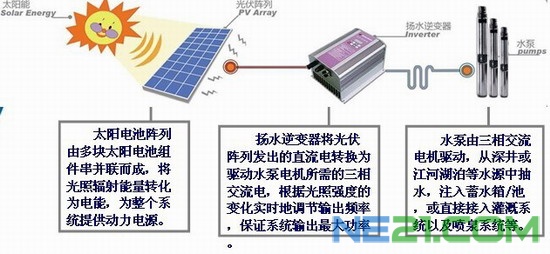 就是通過太陽能產生的直流電轉換成交流電來帶動水泵工作,可以獨立于電網之外。交流水泵比直流水泵應用更廣(直流目前只能限制在小功率),而交流水泵功率從幾百W到幾十KW都有,當然揚程和流量都可以直流水泵大的多,可以用于大規模農業灌溉等。