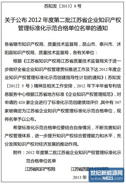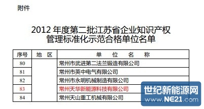 日前,由江蘇省知識產權局和江蘇省質量技術監督局聯合組織的2012年度江蘇省企業知識產權管理標準化示范合格單位評選活動結果揭曉,常州天華新能源科技有限公司獲此榮譽,標志著公司知識產權管理工作邁上了一個新的臺階。