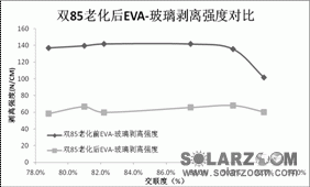 ②高溫高濕老化所引起的EVA力學性能的下降主要體現在兩方面:一是EVA的交聯度越高,其自身的結構越穩定、耐濕熱穩定性越強;二是,高溫高濕老化對EVA與玻璃的剝離強度影響比較大,主要是由于與玻璃接觸的EVA更易水解從而導致粘結點的破壞;
