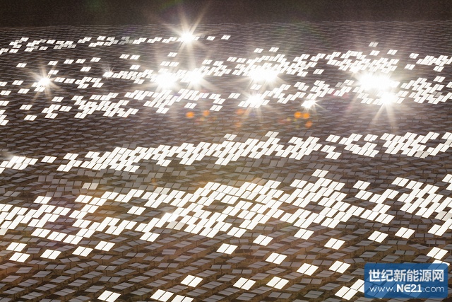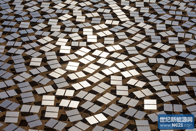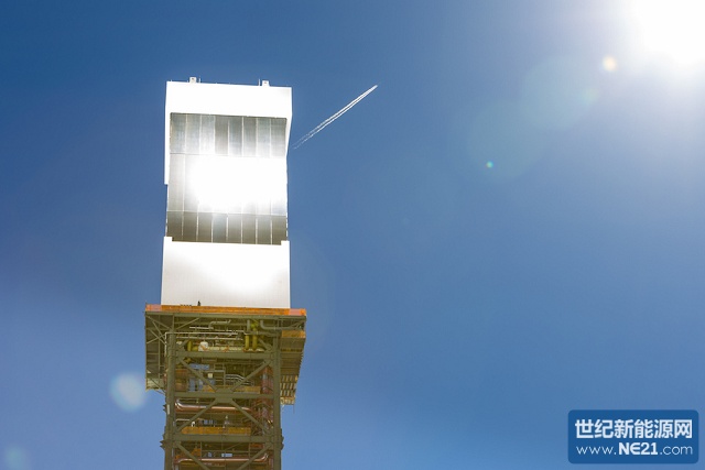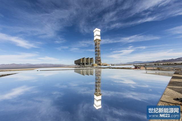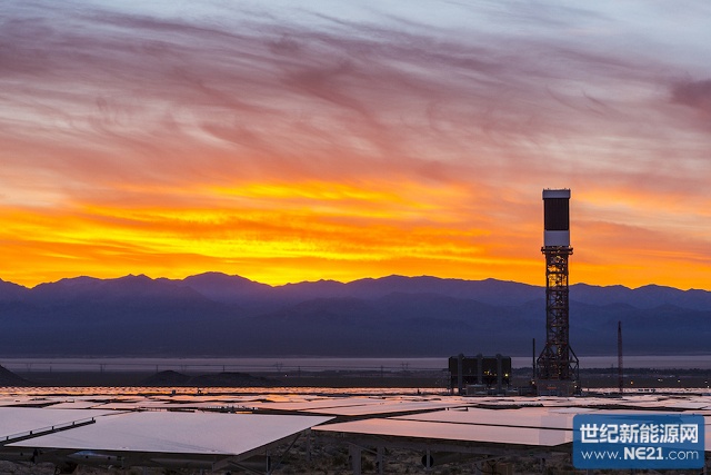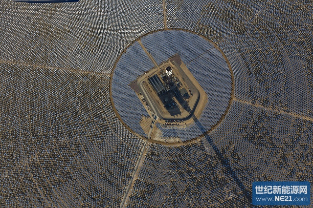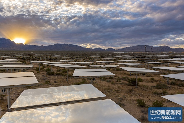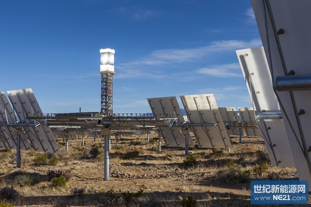 這座太陽能牧場座落在南加州Mojave 沙漠中,占地5.5 平方英哩、稱為中央集光塔的中央高塔高度為459 英呎;透過30 萬片定日鏡(heliostat)玻璃隨著太陽移動跟著變換角度,將光線(能量)集中到中央集光塔的頂端,塔頂?shù)臒嵛掌鞅患訜岬??極高溫,便會啟動熱交換機和鍋爐產(chǎn)生蒸氣來驅(qū)動發(fā)電機。這座目前世界上最大的太陽能電廠,發(fā)電量可應(yīng)付14 萬個家庭使用,相當(dāng)于美國30% 總太陽能發(fā)電量。