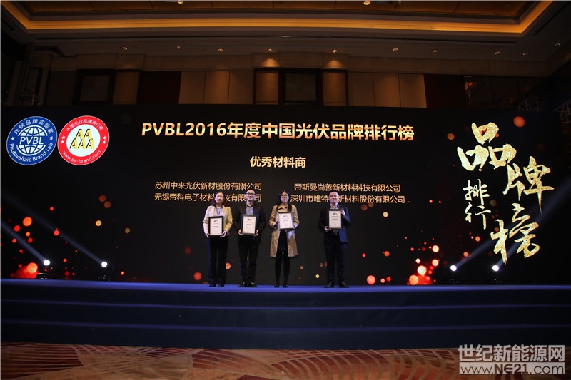 2017年4月16日,《2016年度中國光伏品牌排行榜》在上海舉辦的“2017世紀光伏大會”上隆重發布。世紀光伏大會是由世紀新能源網聯合光伏品牌實驗室主辦的權威行業峰會,2017年的盛會由中國光伏行業協會指導,德國TUV南德意志集團、全民光伏、麥石咨詢提供技術支持,來自光伏、證券、金融、軟件、媒體和各類組織的近400余位嘉賓出席了此次盛會。